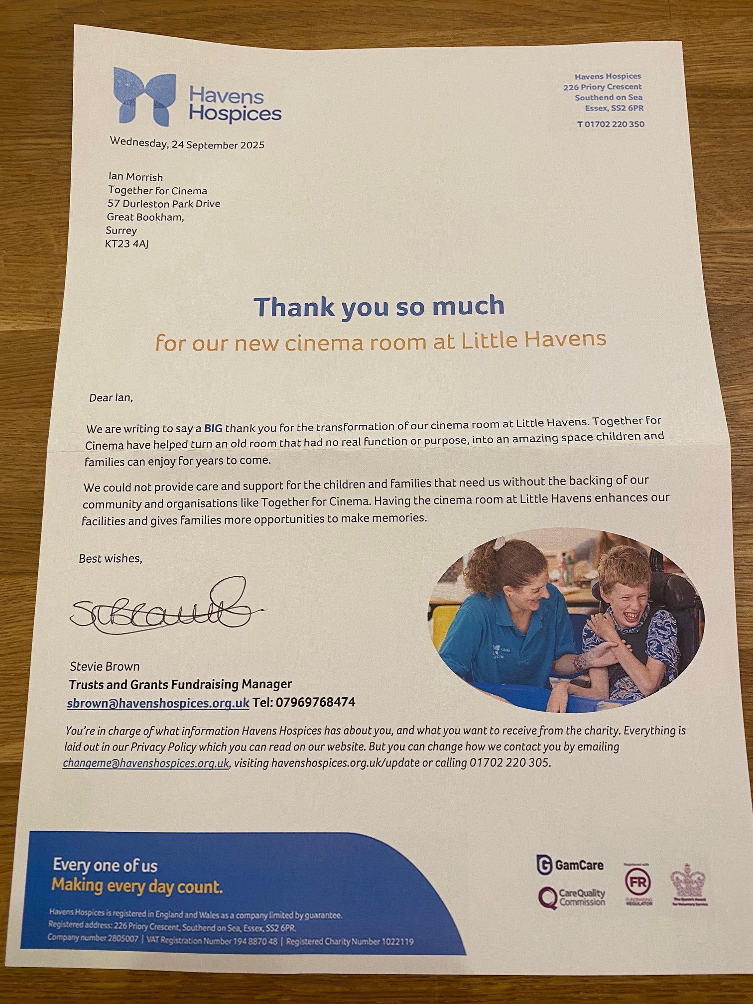 “We are so grateful to Together for Cinema and The Cinema Company for creating our new Cinema Room at Little Havens. This special space is already making such a difference to the children and families we care for. For many of the young people we support, visiting a public cinema simply isn’t possible – whether due to accessibility needs, sensory challenges, or the cost involved. This room removes those barriers, bringing the magic of the movies to them in a safe and welcoming environment.