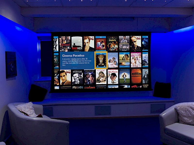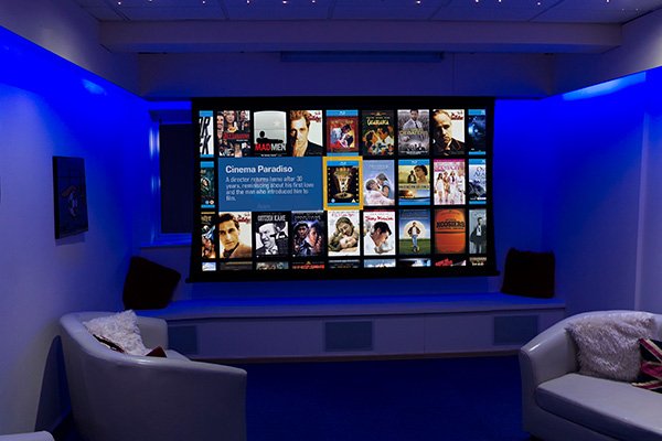 At a press of a button on the Control 4 Touchscreen the electric screen lowers from behind the pelmet, LED’s, Fibre Optics and Downlighters go to a pre-programmed scene, select a movie from the Kaleidescape server and it’s time to grab the popcorn!”