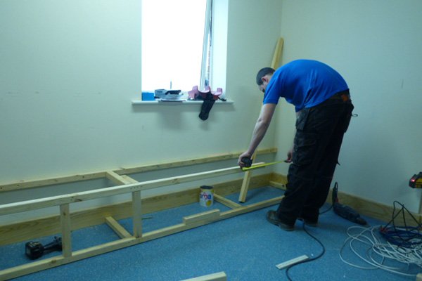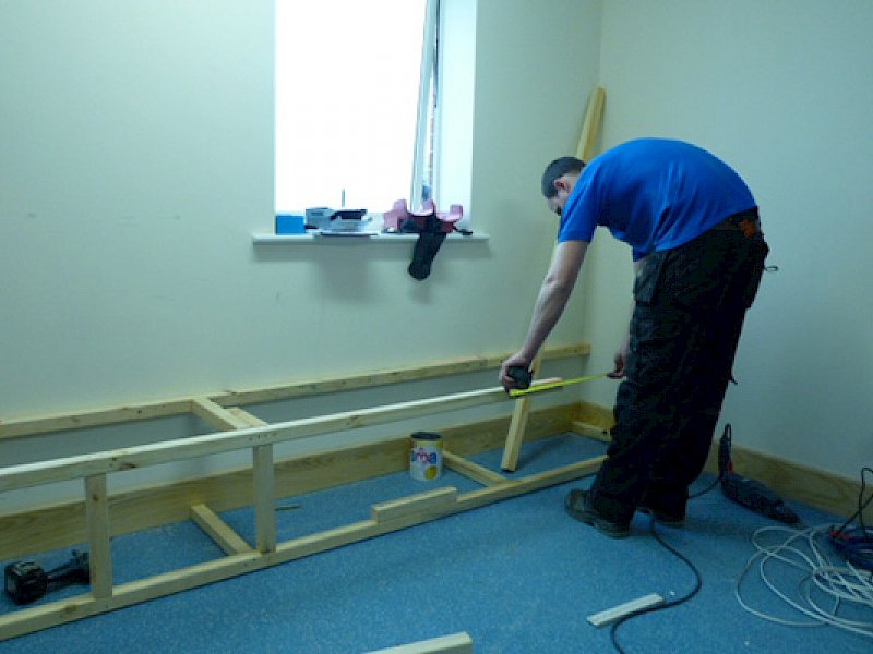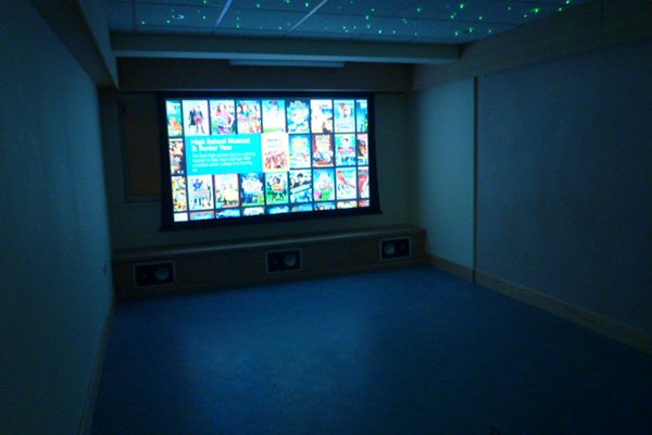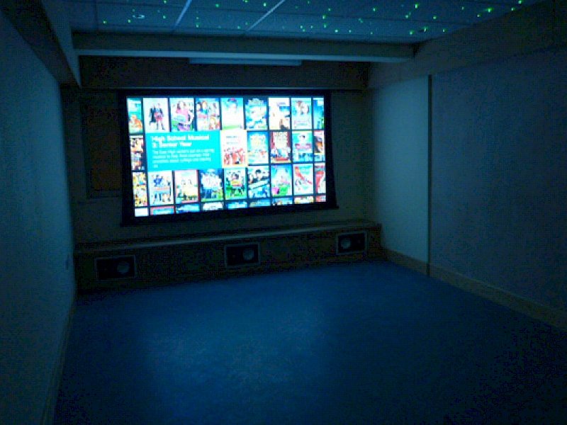 “After an initial survey at Bluebell Children’s Hospice, Colin Scott and Peter Gleadhall came up with some proposals to get the best from the room space. It was decided to construct a box section below the screen to house the front speakers, a pelmet to hide the screen and box section along the sides of the room to hide some heating pipes. This also provided a means of installing RGB tapelighting to create various mood lighting scenes in the room.