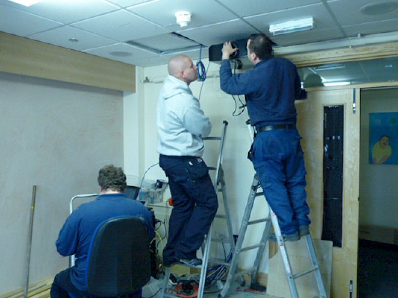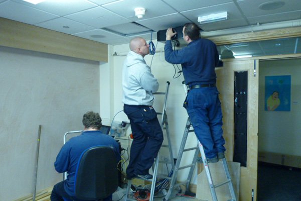 On Thursday 26th July, 2012 Colin Scott and Pete Gleadhall from ET Home Cinema, and Ian Morrish met with Sarah Champion at Bluebell Wood to view the prospective room and consider what options would be suitable for the install. On arriving we were welcomed very warmly and then taken to a room full from floor to ceiling of beds, toys, chairs etc... It was hard to picture exactly what could be achieved but after some shuffling of beds and a bit of investigation Colin and Pete had a vision..., and one that went beyond a regular cinema install...