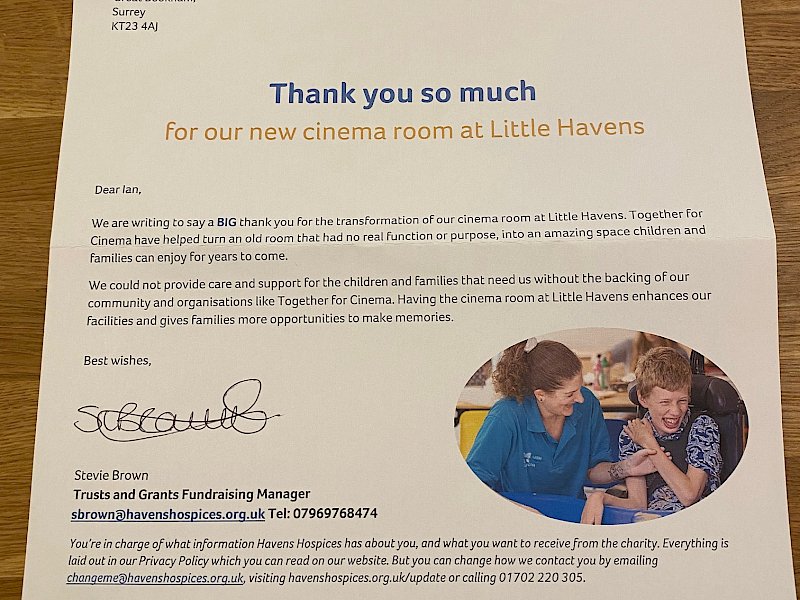 “We are so grateful to Together for Cinema and The Cinema Company for creating our new Cinema Room at Little Havens. This special space is already making such a difference to the children and families we care for. For many of the young people we support, visiting a public cinema simply isn’t possible – whether due to accessibility needs, sensory challenges, or the cost involved. This room removes those barriers, bringing the magic of the movies to them in a safe and welcoming environment.