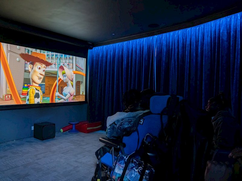 The design is simple but intentional. With dark walls, blackout blinds, a projector and large screen, the room captures the real cinema feel. Its flexibility means we can bring in beds, beanbags, or wheelchairs so that every child can be comfortable and fully included.